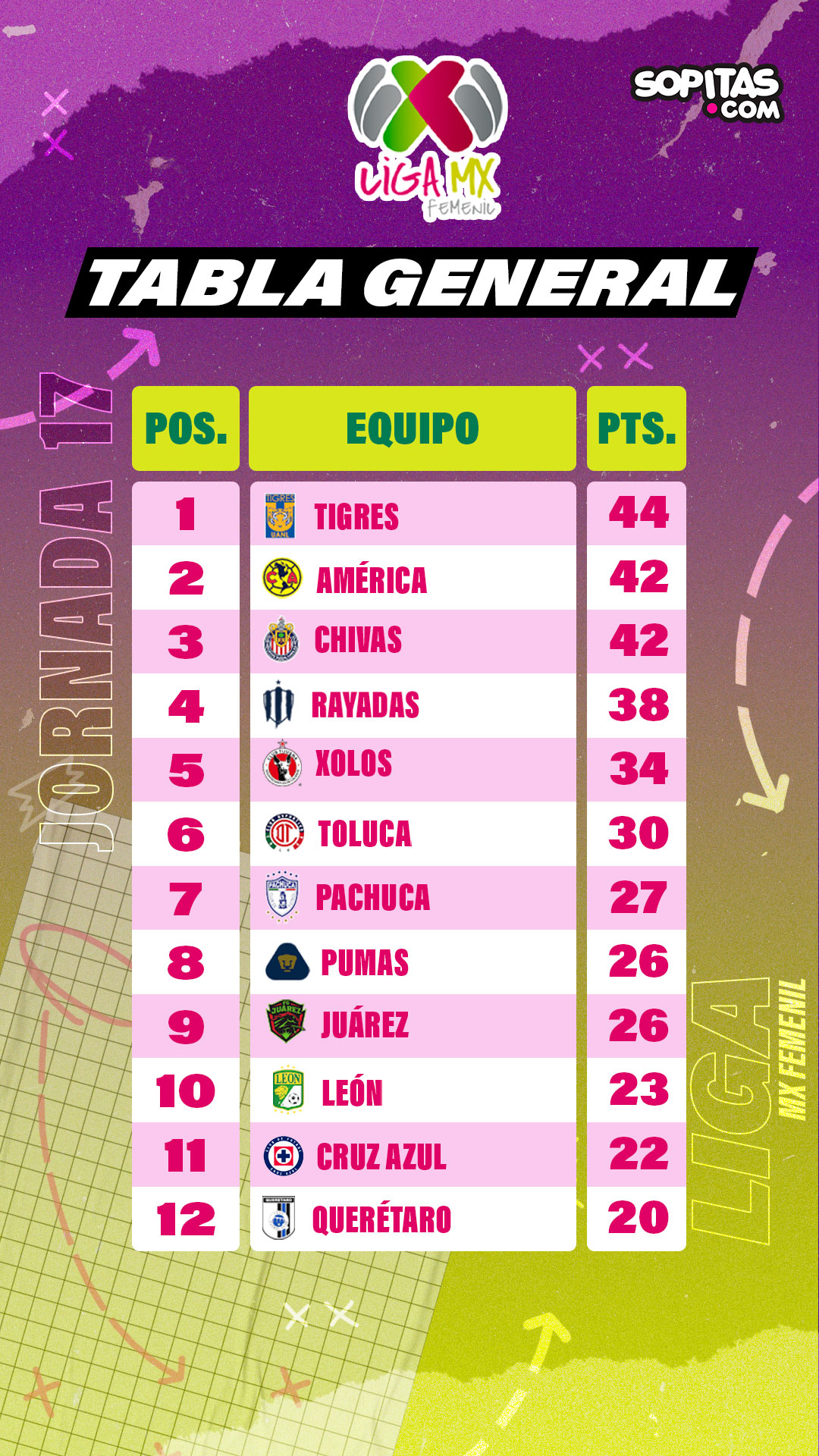 Tabla General Liga Mx Femenil 2024. Los resultados en vivo de la liga mx femenil 2023/2024 en flashscore.com.mx ofrecen resultados en vivo, marcadores, posiciones de liga mx femenil y detalles del partido. América vs guadalajara destaca en los cuartos de final del clausura 2024 de la liga mx femenil.